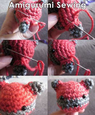 Make sure your sewing is sturdy and you have gone all the way around the object to be sewed on. Below you see that you stick the needle through the front of a stitch on the head, then down through a stitch on the ear. You repeat that process all the way around. Don't change needle directions (ie going up then down then up then down.)
